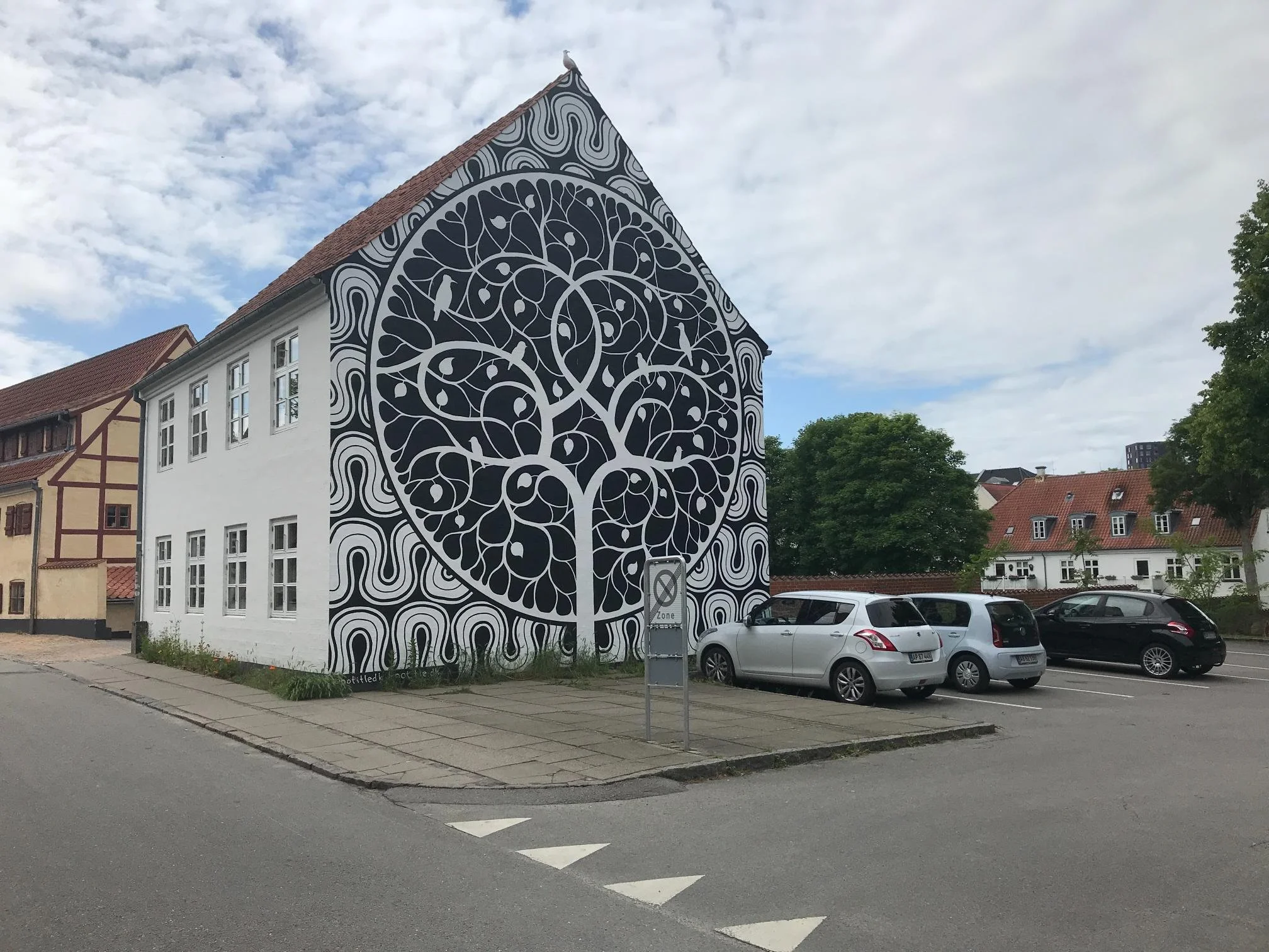 Via de app Parkfornight hadden we een parking op het oog in de buurt van het centrum. We hebben er 1 nachtje overnacht op de parking aan de Christiansgade. Die ligt aan een parkje langs de rivier en is gratis op zon- en feestdaden. Anders 5€ per uur, maar wel wat smal voor grotere campers. Langs die rivier wandel je zo het centrum in.