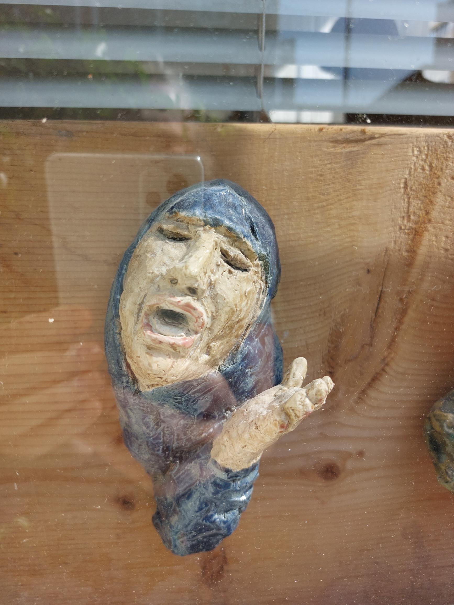 Ik maak zelf beelden in keramiek. Groot was mijn blijdschap toen ik achter vele ramen sculpturale keramiek ontdekte. Dat bleek een overblijfsel van een project enkele jaren gelden, waar de bewoners gevraagd werd een beeld uit klei voor hun raam te plaatsen. Zo ontstond een mooie keramiekroute waar je nu nog her en der sporen van kan terugvinden.